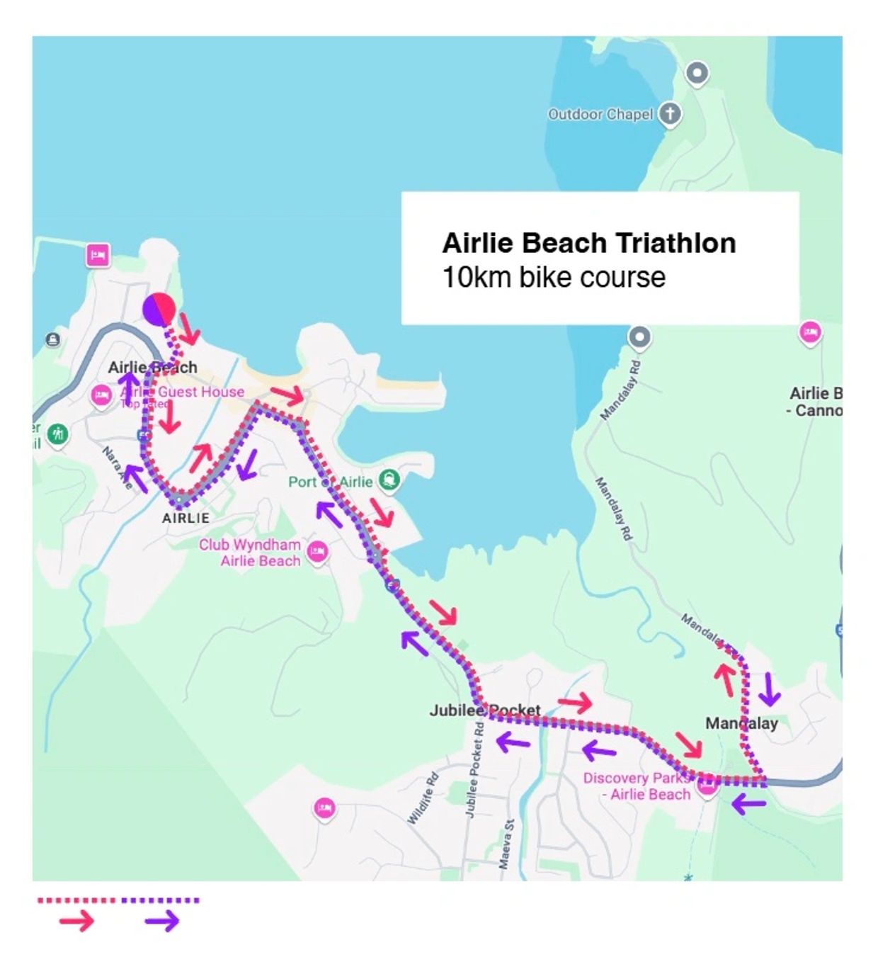 Athletes leave T1 and head through the Airlie Beach roundabout and onto Shute Harbour Road. Athletes continue on this road out towards Mandalay with breathtaking tropical seaside landscape that Tropical Queensland and the Whitsunday Coast is known for. Turning point will be on Mandalay Rd. The course is mostly flat and fast!