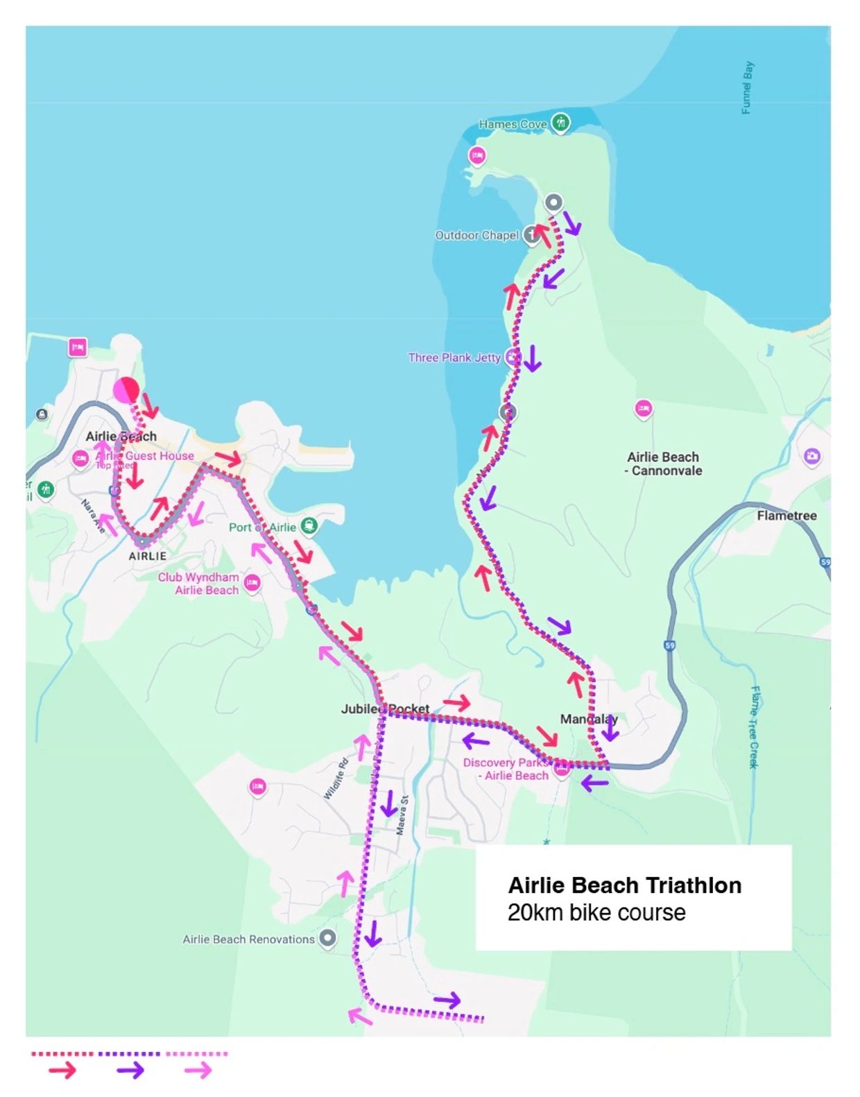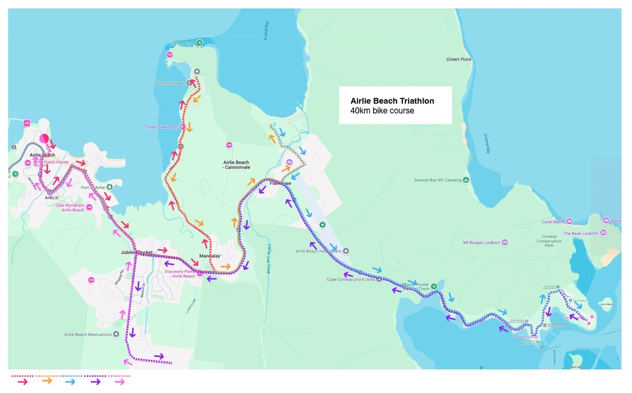 Athletes leave T1 and head through the Airlie Beach roundabout and onto Waterson Way. Athletes continue on this road out towards Mandalay with breathtaking tropical seaside landscape that Tropical Queensland and the Whitsunday Coast is known for. Turning point will be the end of Mandalay Rd, the course will also taken in the length of Jubilee Pocket/Timberland Rd. The course is mostly flat with a challenging hill climb on Mandalay Rd!